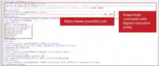 图12这个样本使用字符串和内容混淆的逃避技术以绕过策略执行powershell,并且检测在maxmind.com上的IP地址以对抗反病毒厂商的黑名单