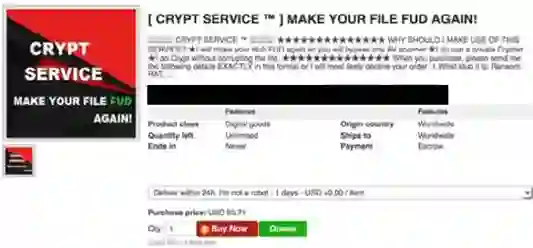 一些卖家提供一个FUD文件的服务。 该服务更昂贵,这可能是由于提供商使用高级技术,如代码操作,高混淆或其他技巧与自己的定制crypters.