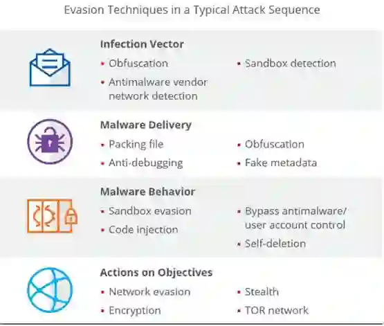在过去一年中,我们分析了许多包含逃避能力的恶意软件样本。在典型的攻击中,攻击者在攻击流程的许多步骤中都使用逃避技术。