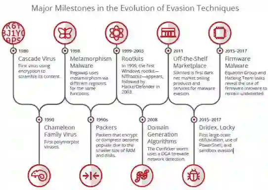自从1980年首次出现以来,恶意软件的逃避技术已经变得更加广泛和复杂。以下是逃避技术演进的主要里程碑:
