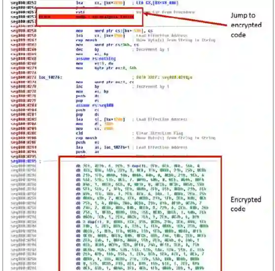 我们可以看到一部分Cascade代码。红色突出显示由反汇编程序自动生成,并指示其余代码不存在。 这是因为加密代码需要解密。 解开这种类型的恶意软件的一个简单的方法是运行可执行文件,让解密例程解密其余的代码。