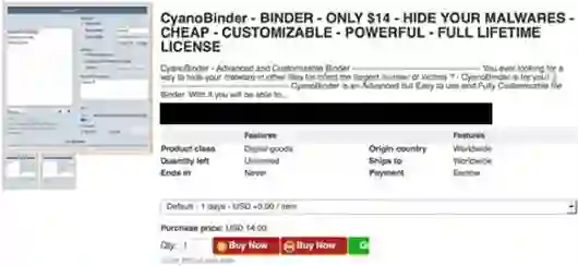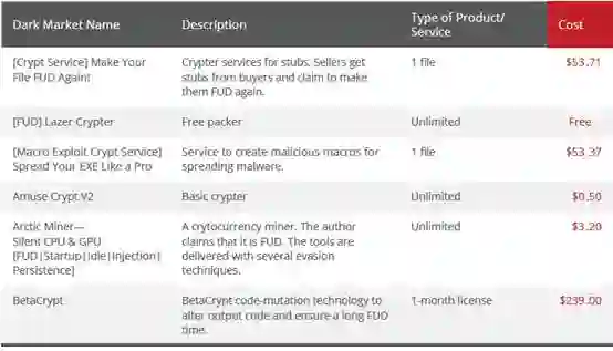 一些卖家将几种逃避技术汇总成一种工具,并将其在地下市场上销售给复杂的恶意软件编写者或其附属公司,负责传播恶意软件以支持大型广告。