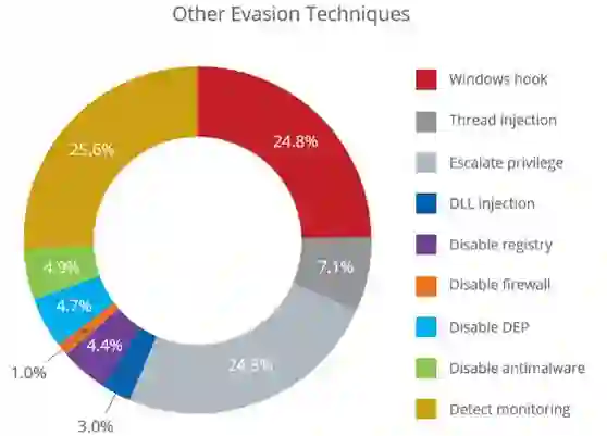 恶意软件使用许多其他的技术来逃避检测。Detectingmonitoring和windowshook(改变windows函数的内部行为)是常见的技术。权限提升在关闭反恶意软件工具很或者执行一些其他的需要admin权限的指令中很流行。