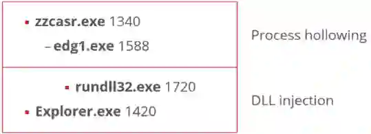图13在这个例子中,Dridex使用processhollwing逃避技术来向一个暂停进程中注入恶意代码。然后新进程调用rundll32.exe,这个程序向explorer.exe加载恶意的DLL。