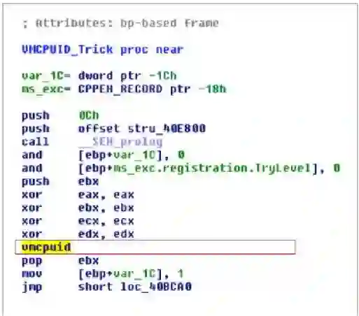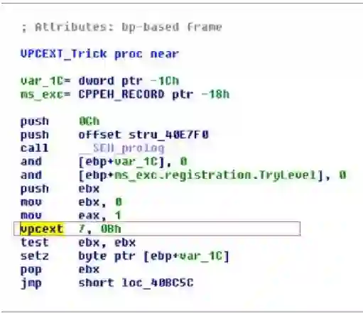 图27VPCEXT指令(可视化容器扩展器)是Necurs用于检测虚拟系统的另一种反虚拟机技巧。这种技术没有文档化,并被其他几个机器人使用。如果指令的执行没有产生异常,则恶意软件在虚拟机上运行。