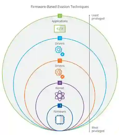 将恶意代码插入固件是避免检测的非常有效的方法。固件恶意软件可以控制许多系统组件,包括键盘,麦克风和文件系统。它不能被操作系统检测到,因为感染发生在Ring -1中,内核中的最深点,恶意软件具有很多权限,并且几乎没有安全检查。