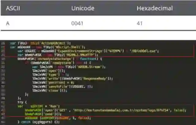在前一种情况下,恢复代码是微不足道的,因为很容易反解Unicode,这是一种用于不同格式可打印文本的编码标准。 此片段中的每个Unicode字符对应于ASCII字符。