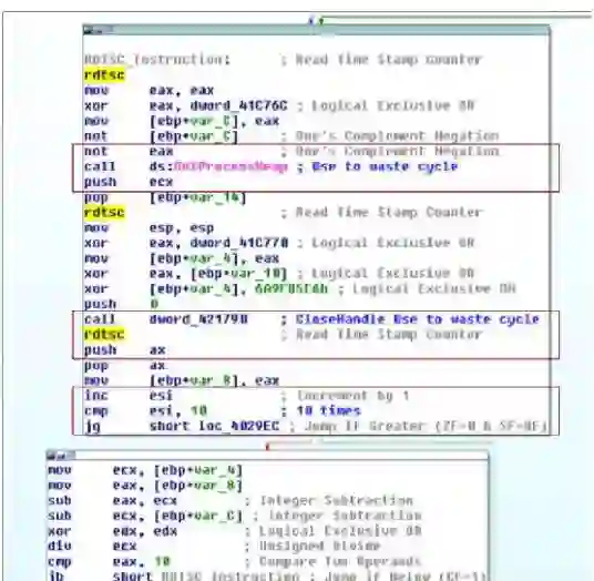 Locky和其他恶意软件使用的另一个技巧是Read TimeStamp Counter(RDTSC)x86指令来检测虚拟环境。时间戳计数器记录复位以来的处理器周期数。指令RDTSC简单地返回存储在寄存器edx:eax中的计数器的值。