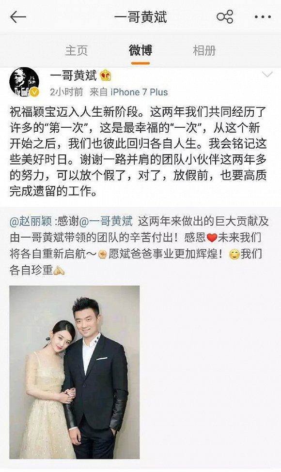 10月9日,赵丽颖微博宣布和经纪人黄斌合作关系终止,“未来我们将各自重新起航,愿斌爸爸事业更加辉煌”,随后黄斌转发回应“祝福颖宝迈入人生新阶段”。