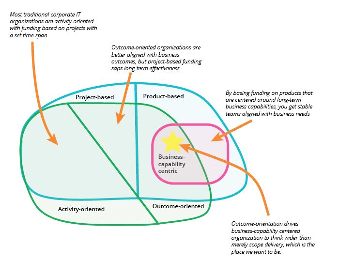 微服务的另一个特点在于Product over Project,这需要不同于传统投资组合的预算管理与团队组建。传统的项目制将预算分配在相对短期的服务开发过程中,项目团队关注的是如何将业务范围(scope)实现,开发结束后服务转交运维团队进行维护,项目团队则被解散进行其他项目的开发。将微服务作为产品运营则需要建立业务结果导向的稳定产品团队。服务的设计不只聚焦于当下需求,更需要考虑价值定位和产品愿景。工程团队则需要思考如何用有限成本支撑非线性的业务接入增长。