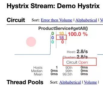 观察结果:部分请求被立刻拒绝,加速服务失败的判定,熔断器开启