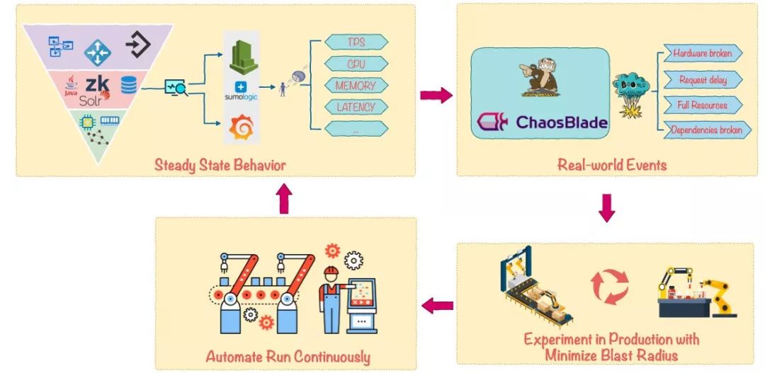 混沌工程类似于“故障演练”,不局限于测试,而更像是工程实践。为什么这么说,通常的测试用例会有“期望结果”和“实际结果”,通过将两个结果比较,或者对用户行为的预期,来判断测试通过或失败。而混沌试验类似于”探索性测试“,试验本身没有明确是输入和预期结果,通过对系统和服务的干预,来观察系统的”反应“。我们将混沌工程原则融入在试验过程中:在生产环境小规模模拟系统故障并定期自动化执行试验,通过试验结果与正常结果进行比对,观察系统”边界“。