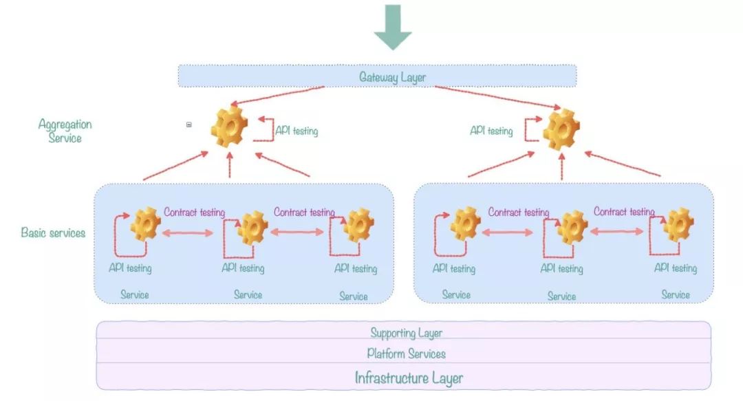 下图,我们聚焦于微服务架构的业务服务层,在API测试之外在基础服务的调用方和提供方之间增加了契约测试: