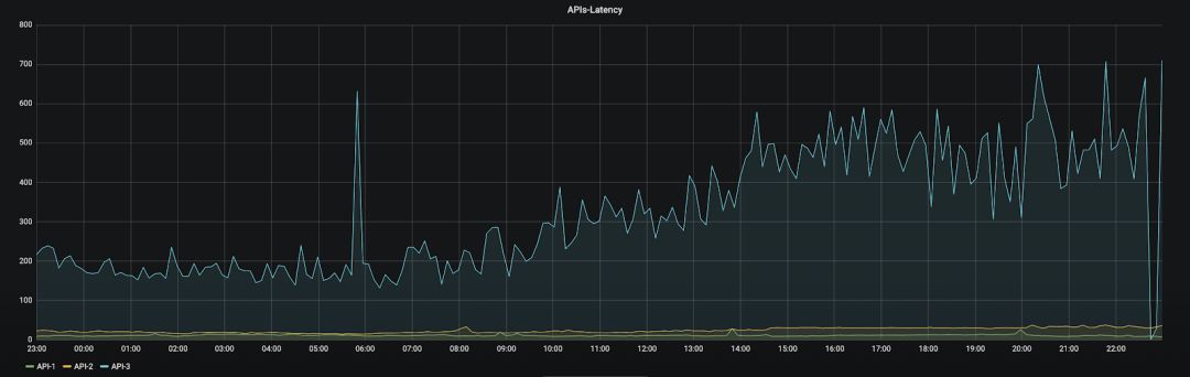 观察API延时基线:(可以看到API-1和API-2平均延时低于300ms,API-3在300ms-700ms之间)