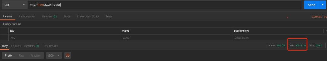 2.查看PROVIDER-SERVICE instance 2的延时是否生效。通过postman测试,可以看到API响应为30s: