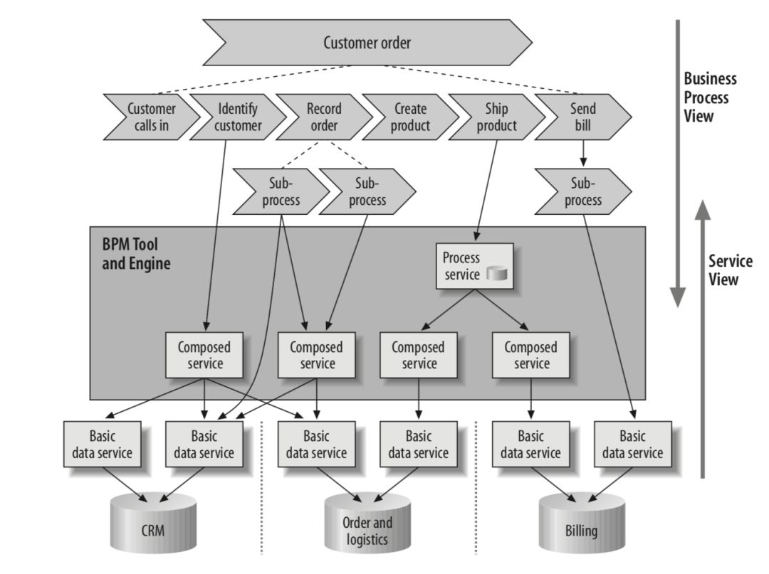 早期的服务只是单纯的技术构件,大多数组织从纯粹的技术实现角度考虑服务的划分。SOA的推动者们指出企业的信息资产应该被复用,信息孤岛应该被打通。通过将不同的服务编排组合,我们应该能够实现IT对业务更加灵活的支撑。