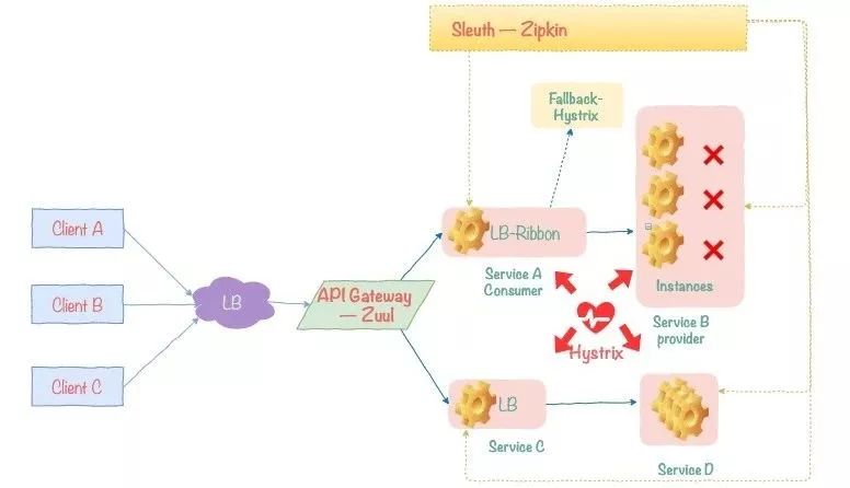 示例项目架构:Eureka服务发现注册,一个PROVIDER-SERVICE且有两个实例,一个CONSUMER-SERVICE,也可以通过zipkin之类的分布式跟踪系统也可以看到服务调用关系。