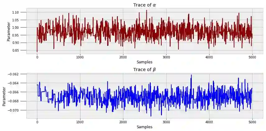 在 MCMC 中,通常高达 90% 的轨迹会被抛弃。该算法无法立即收敛到真正的分布,且初始值往往并不准确。后期的参数值通常更好,这意味着它们是适用于建立模型的参数。我们使用了 10000 个样本并丢弃了前 50%,但是一个行业的应用可能会使用数十万甚至上百万个样本。