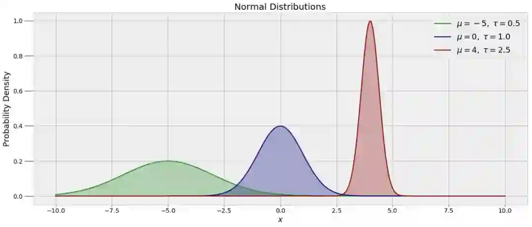 为了绘制 α 和 β 的随机值,我们需要假设这些值的先验分布。由于我们对参数没有任何提前的假设,我们可以使用正态分布。正态分布也称高斯分布,它由均值和方差定义,分别显示数据的位置以及扩散情况。下图是具有不同均值和方差的几种正态分布: