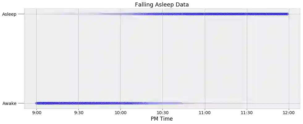 上图中,每个数据点都用点表示,点的强度显示在特定时间的观测数量。我的手表只能记录我入睡的那一分钟,所以为了扩大数据量,我在精确时间的两边增加以分钟为单位的数据点。举例而言,如果我的手表显示我在晚上 10:05 入睡,那么 10:05 之前的每一分钟都被表示为 0(清醒),10:05 之后的每一分钟都被表示为 1(睡着)。这将大约 60 个夜晚的观测数据扩展到了 11340 个数据点。