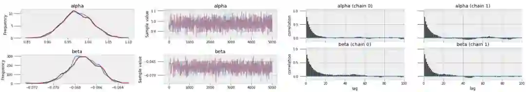 给定足够多的迭代次数,MCMC 将收敛于真实值。但是,对收敛进行评估可能比较困难。对此我将不在本文讨论(一个方法是测量轨迹的自相关),但是,如果我们想要结果最准确,这是一个重要的考虑因素。PyMC3 建立了评估模型好坏的函数,其中包括轨迹图和自相关图。