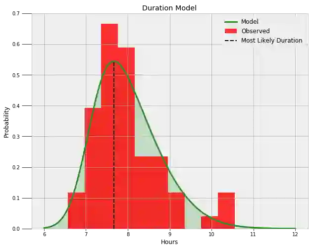 看起来拟合得不错!我们可以通过查询模型,找到我至少可以获得一定睡眠时长的概率,同时也能找到最可能的睡眠时长: