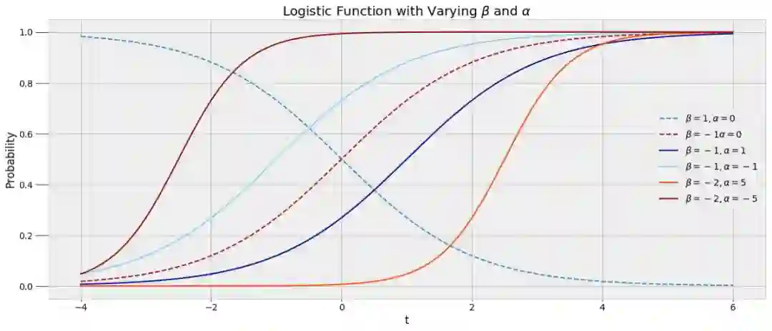 其中,β 和 α 是我们在 MCMC 过程中必须学习的模型参数。具有不同参数的 logsitic 函数图像如下所示。