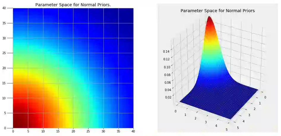 马尔科夫链蒙特卡罗方法分为两部分。蒙特卡罗指的是使用重复随机样本获得数值解的一般性技术。蒙特卡罗可以被视为进行了若干次实验,其中每次都对模型中的变量进行改变并观察其响应。通过选择随机数,我们可以探索大部分参数空间,即变量可能值的范围。下图显示了我们的问题使用正常先验后的参数空间。