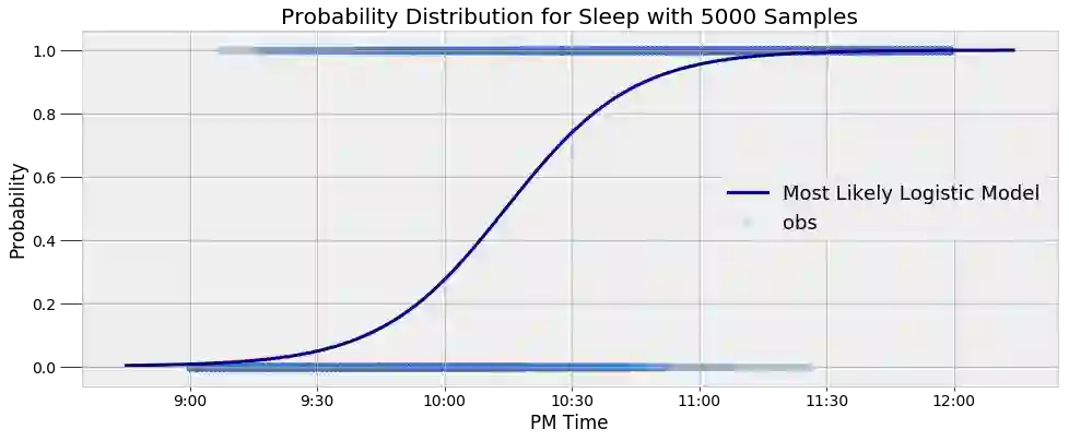 logsitic 函数很适合本案例中的数据,因为入睡的可能性会逐渐转变,此函数能捕捉睡眠模式之中的变化情况。我们希望能够在函数中插入时间 t,获得睡眠概率(其值在 0 和 1 之间)。我们最终得到的不是在晚上 10:00 入睡与否的直接答案,而是一个概率。为了建立这个模型,我们使用这些数据,通过 MCMC 寻找最佳的 α 和 β 参数。