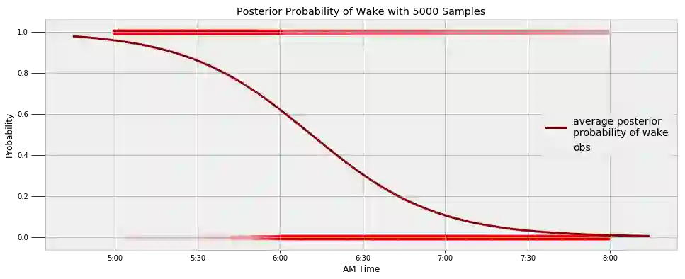 我可以使用描述早晨醒来时间的数据建立一个类似的模型。我定了一个闹钟,努力在早晨 6:00 起床。但是可以看到,我并非每日都是如此。下图展现了我从入睡到醒来过渡过程的最终模型以及观察数据。