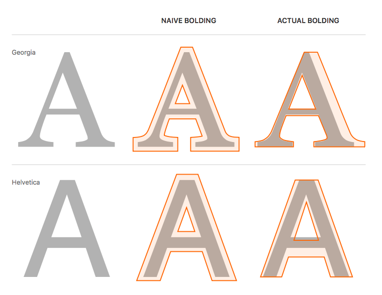 正如你所见,无论是在有衬线的情况下,还是在无衬线的情况下,幼稚的加粗程序都产生了很不一样的结果。例如,在Georgia字体中,左侧的笔划只是略微加粗,右侧的笔划则明显加粗了,但只加粗了一侧。在这两种字体中,加粗不会改变字体的高度,而幼稚方法却改变了高度。