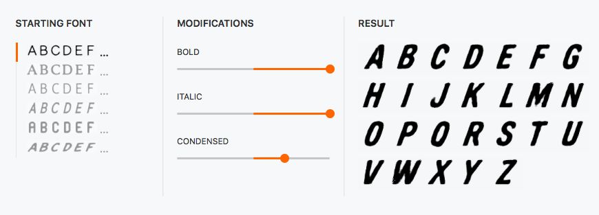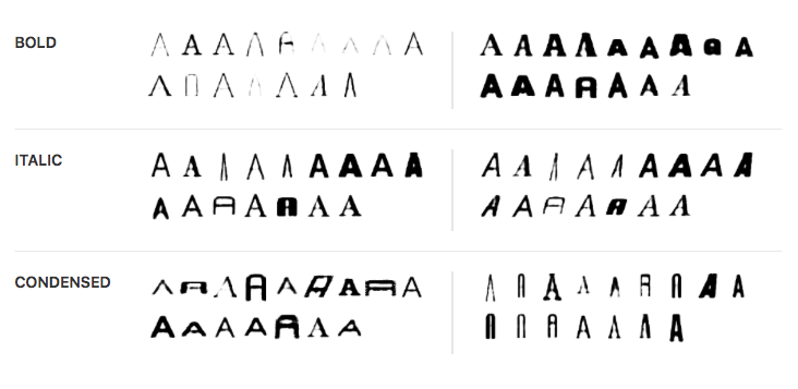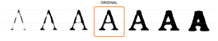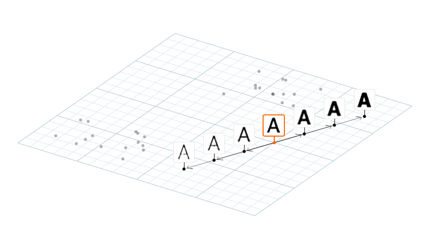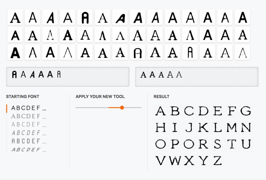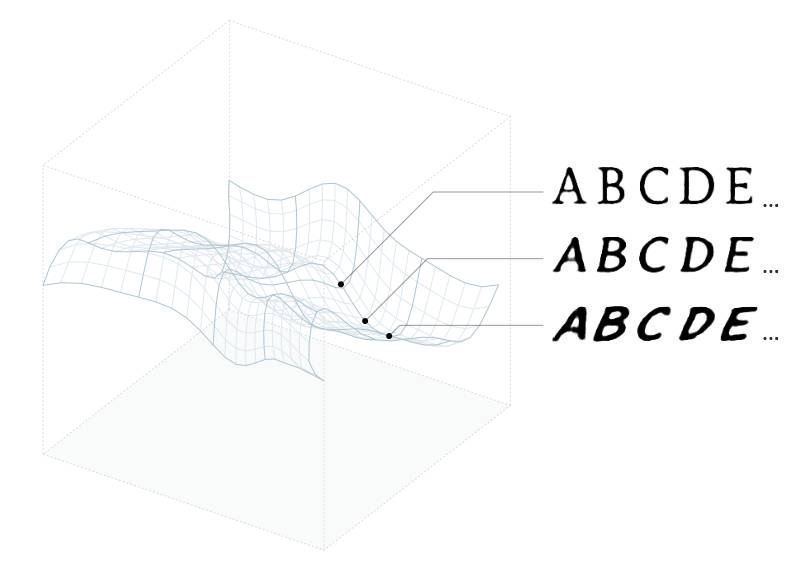 我们来看一个机器学习模型使得新型接口成为可能的例子。为了理解这个界面,你可以想象自己是一个字体设计师,正在创建一个新字体。(我们会很过分地不顾字体和字型的区别。向任何可能正在阅读本文的字体设计师致歉。)草绘一些初步的设计后,你想试下粗体、斜体和长体这样的变体。让我们来看看一个从初始设计中生成和探索变体的工具。结果的质量是相当粗糙的,稍后将解释具体原因,请多多包涵。