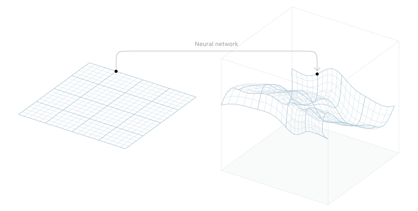 我们通过构建一个神经网络来完成这个任务,这个神经网络需要一些输入变量(数量不大),这些输入被称为潜变量(latent variables),并产生整个字形作为输出。我们使用的具体模型有40个潜在的空间维度,将其映射到4096维空间可以描述字形中所有的像素。换句话说,这个想法是将一个低维空间映射到一个高维空间: