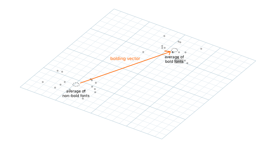 回到生成式模型的基本细节,我们如何使用这样的模型来制作类似于前文所示的基于样例进行推理的工具呢?我们来考虑一下加粗工具的情况。在这种情况下,我们接受用户指定的粗体字体的所有潜向量的平均值,和所有用户指定的非粗体字体的平均值。接着我们计算这两个平均向量之差: