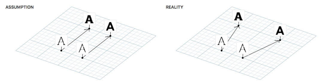 为了让需要接受任意初始字体的属性向量有效,我们可以通过在隐空间这加上同一向量构建相应的粗体。然而,我们可以推理得到,没有理由使用一个单一的常量向量进行位移会有效。我们可能需要进行许多不同的位移。例如,用于加粗衬线字体和无衬线字体的启发有很大不同,因此看起来会涉及到非常不同的位移: