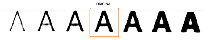 审视下左侧和右侧的字形,我们看到许多不幸的人工产物。特别是最右边的那个字形,边缘开始变得粗糙,衬线开始消失。更好的生成式模型可以减少这样的人工产物。这是一个很好的长期研究计划,提出了许多有趣的问题。不过,即使就我们现有的模型而言,使用生成式模型也有一些明显的好处。
