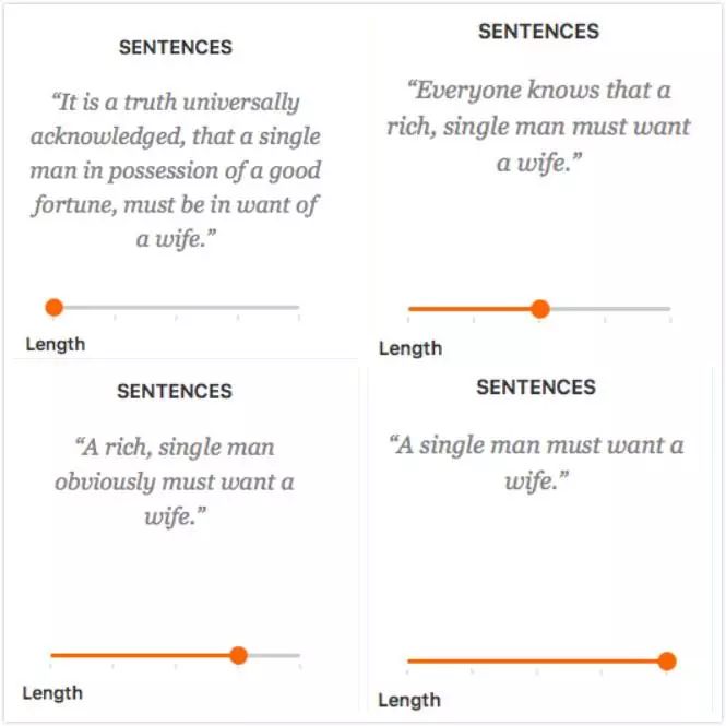 取自《傲慢与偏见》的句子。灵感来自Writing with the Machine. R. Sloan. Eyeo. 2017.