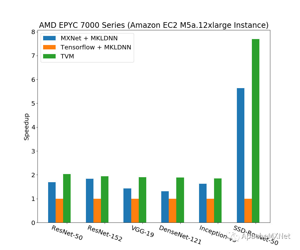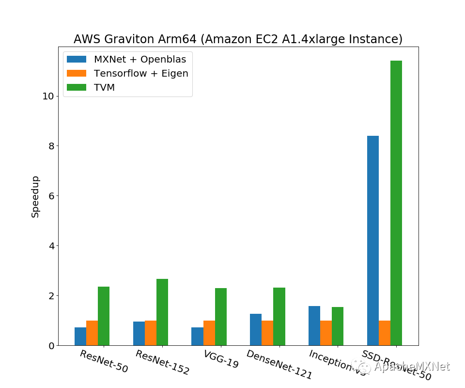 当时(现在也是)功能最全社区活跃度最高的开源深度学习编译器是TVM,它可以接受不同框架(Keras/MXNet/TensorFlow/...)的模型并编译到多种设备(CPU/GPU/FPGA/...)上。由于TVM的编译做了不同粒度的优化,在端到端(end-to-end)性能上有时甚至能得到几十倍的加速。TVM发起于华盛顿大学(当时的)在读博士生陈天奇,AWS AI从一开始就在活跃地参与这个开源项目,一直都是TVM社区最大一股的工业界力量。