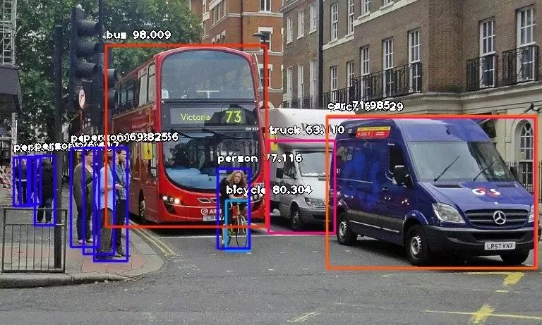 在上面的 5 行代码中,第一行定义了目标检测类,第二行将模型的类型设置为 RetinaNet,并在第三行将模型路径设置为 RetinaNet 模型的路径,第四行将模型加载到的目标检测类,第五行调用目标检测函数,解析输入的和输出的图像路径。