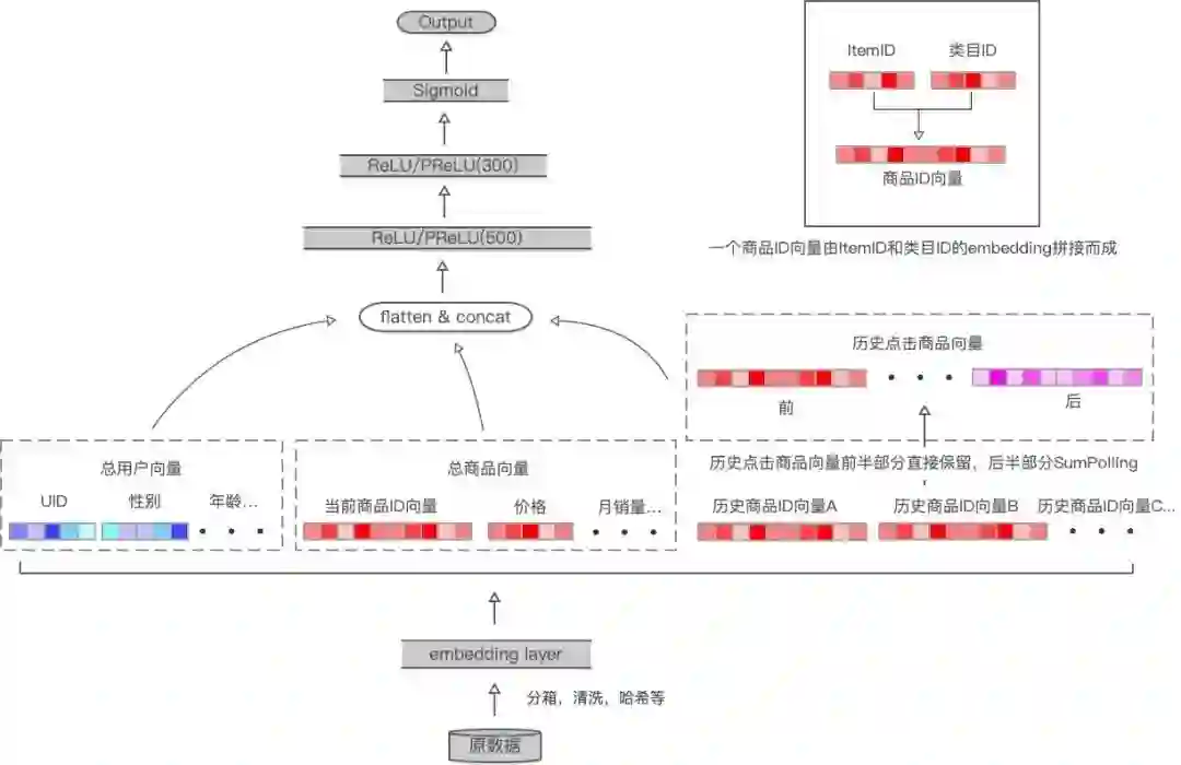 后来翻阅各种资料,受YouTube Net ( Deep Neural Networks for YouTube Recommendation )、和DIN ( Deep Interest Network ) 等文章的启发我们把用户的点击序列加入到模型当中,用户的行为序列往往能非常好的刻画该用户的兴趣分布。和DIN不同的是,我们没有对用户行为序列做attention,我仅仅把序列做了一次sum。总的来说和sum相比attention并没有明显优势,而且计算量更大。另外average的效果也略差于sum,看其他一些团队的经验貌似也有类似结论,所以我线上模型仅对序列做了sum。这一次改动auc提升了2个点左右,线上ctr有接近10%的提升。