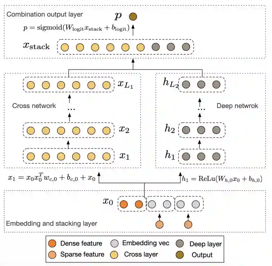 DCN和DeepFM相比主要区别是左边FM部分替换为一个cross network的网络,其中第L+1层表示为Xl+1=X0XlTwl+bl+Xl,可以简单理解为前一层和第0层 ( 即输入层 ) 的特征组合。虽然cross net可以非常方便的控制任意高阶的特征组合,相比FM的二阶组合更具优势,但是从公式可以看出每一层都与输入层有太强的关联,因此高阶的特征交叉和一阶特征有很大相关性。
