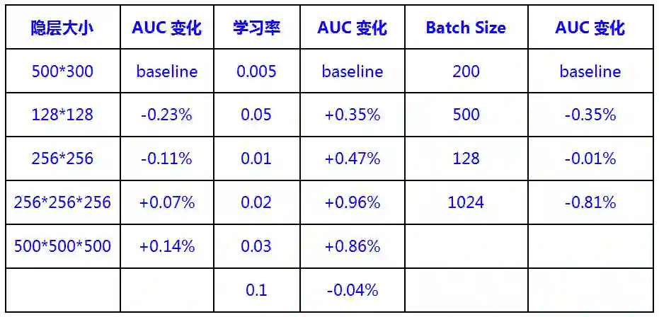 在快报的数据集分布上,改变学习率带来的提升比较明显,由于Adam优化器占用内存大,使用Adagrad所以对应的batch size较小,可能不同于其他文章中分享的经验。网络层数越高准确度越高,结构影响很小,当达到一定层数后再提升带来的收益很小,综合考虑计算成本取了500*300层。
