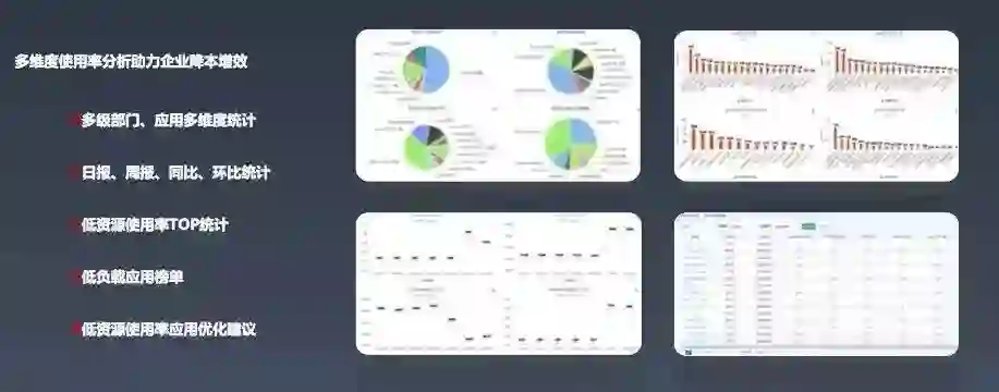 再比如提供各应用、部门的资源使用率报表以及低资源使用率榜单,以此督促资源使用率较低的应用或部门进行缩容整改。