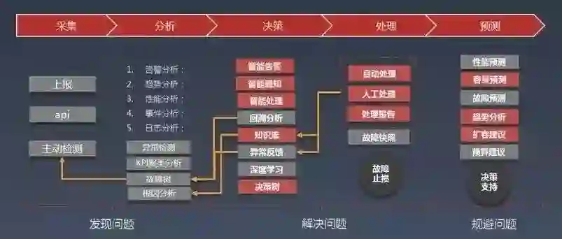 前面已经有提及,AIOps 主要从发现问题、解决问题、规避问题三个方面来设计和实施。对于发现问题,很多在做 AIOps 的厂商都已经做的很完善了,包括异常检测,根因分析、智能告警、性能分析、事件分析、日志分析等。