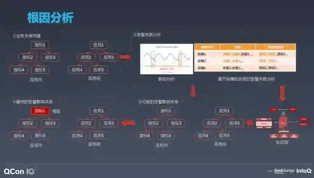 但在实际应用中,通常我们探测的拓扑关系比较复杂需要结合人工标注的方式为拓扑增加相应的权重作为拓扑依赖关系的一个修正。有了应用拓扑之间的依赖关系之后,基于大量历史告警数据进行自学习,分析每个故障时间点应用和指标之间的关联关系汇总为知识库数据,并存储到知识库系统。