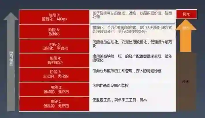 关于智能运维的发展,我们将发展过程分为以上七个阶段。前三个阶段从手工运维发展到面向业务服务的主动管理。第四个阶段是服务驱动,该阶段建立了统一的 CMDB 系统,这时候我们需要服务的流程化来支撑整个运维体系,比如一些工单系统等等。