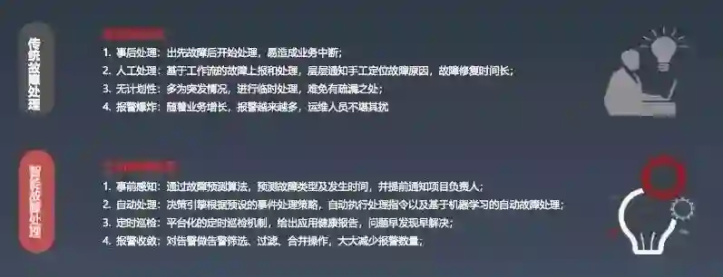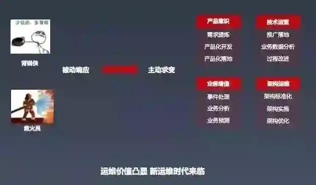 由传统运维向智能运维的转型,除了产品、技术架构的升级之外还需要运维团队由背锅、救火式的被动运维向主动发现、处理、规避问题的主动运维转变来驱动。以上说到的诸多挑战和新技术的发展倒逼运维人员主动寻求变化,不能像以前一样,一提到运维就是背锅侠或者救火队员。要改变这种被动运维的方式,首先就要转变思想:运维也可以主动。可以从哪些方面主动呢?