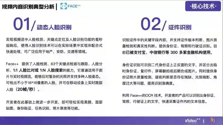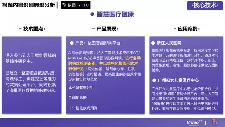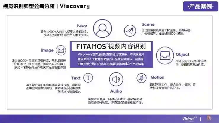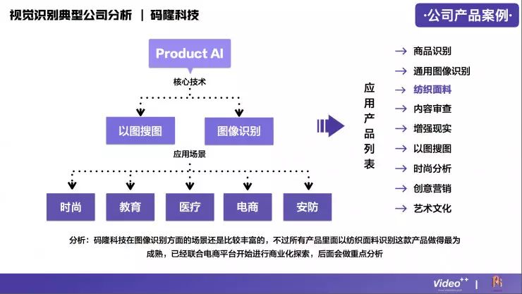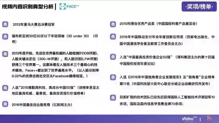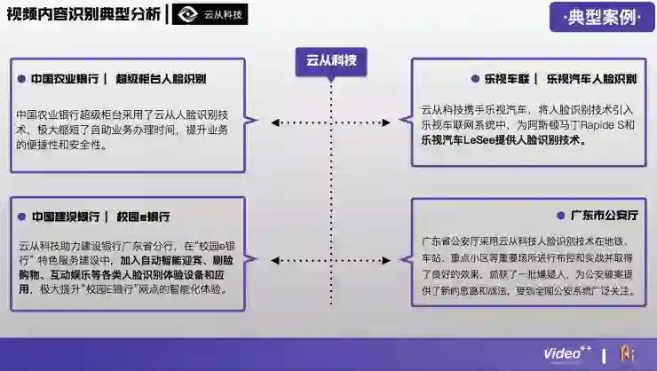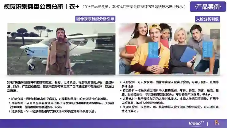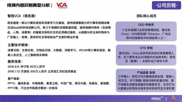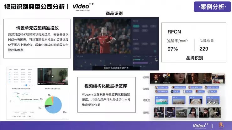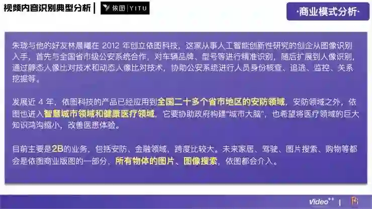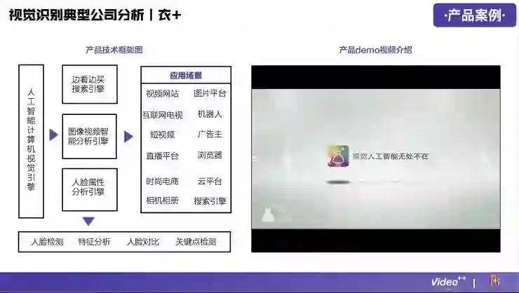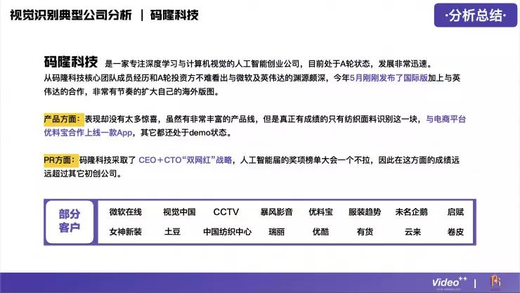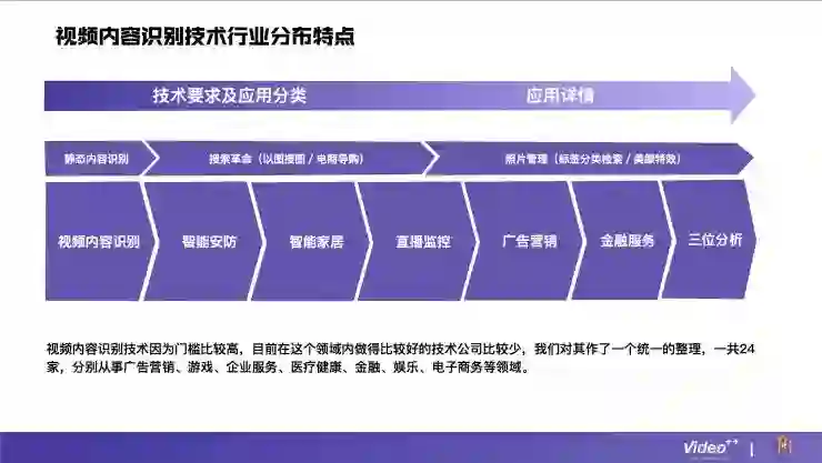 视频内容识别技术在整个行业中是比较难的,门槛比较高,所以在这个领域做得比较好的公司并不多,目前国内大概有24家,分别涉及到广告营销、游戏、企业服务、医疗健康、金融、娱乐、电子商务等领域。