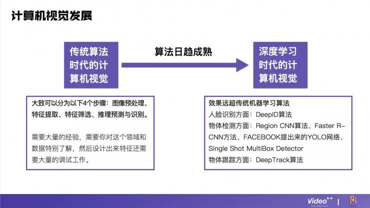 而从计算机视觉领域本身来看,传统机器学习的算法需要大量的经验,需要研究的人员对这个领域和数据特别了解才行。而现在由于深度学习的应用,效果得到了极大的改观,并出现了一系列针对不同细分领域的算法,例如人脸识别方面有DeepID算法、物体检测方面有Region CNN算法、Faster R-CNN方法等。