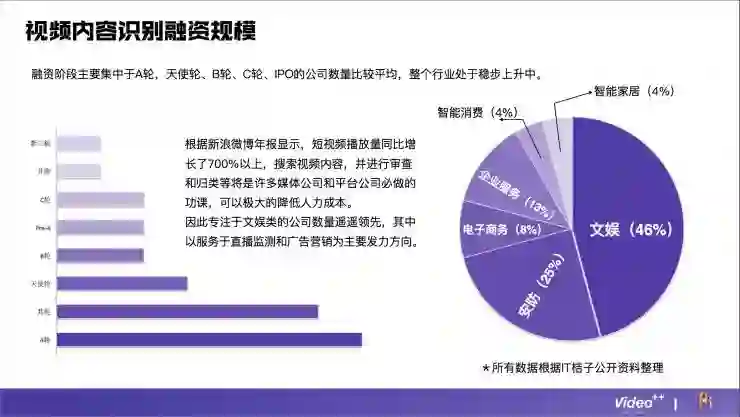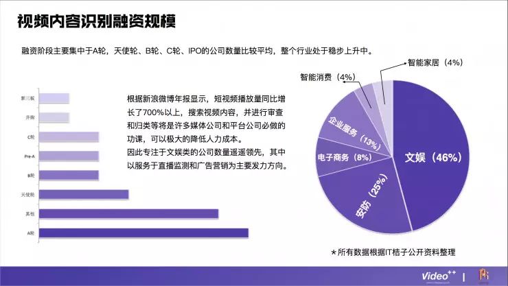 在融资方面我们可以看到两个特点:第一、大多数企业正处在A轮融资阶段,这说明大多数企业都还处于刚起步阶段;第二、专注做文娱的公式占差不多一半左右,这主要是因为目前短视频播放量增长迅猛,搜索视频内容、审查、归类等是许多媒体公司和平台公司必做的功课,可以极大的降低人力成本。